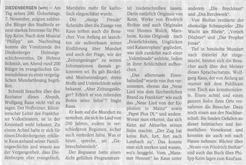 Hofheimer Zeitung vom 23. November 2004: "Mundart nach Keim, Stotze und Walch"